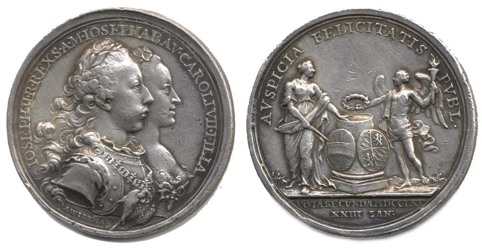 A.Widemann - na sňatek Josefa II. s Marií Josefou Bavorskou, Dvojportrét zprava, opis / Austria a anděl u piedestalu se znaky, 2řádk.nápis v úseči, opis, 23.1.1765, Sign., Ag 40 mm, 26,20 g Mo.1938, Ho.3136, MZČ.97/20_R!