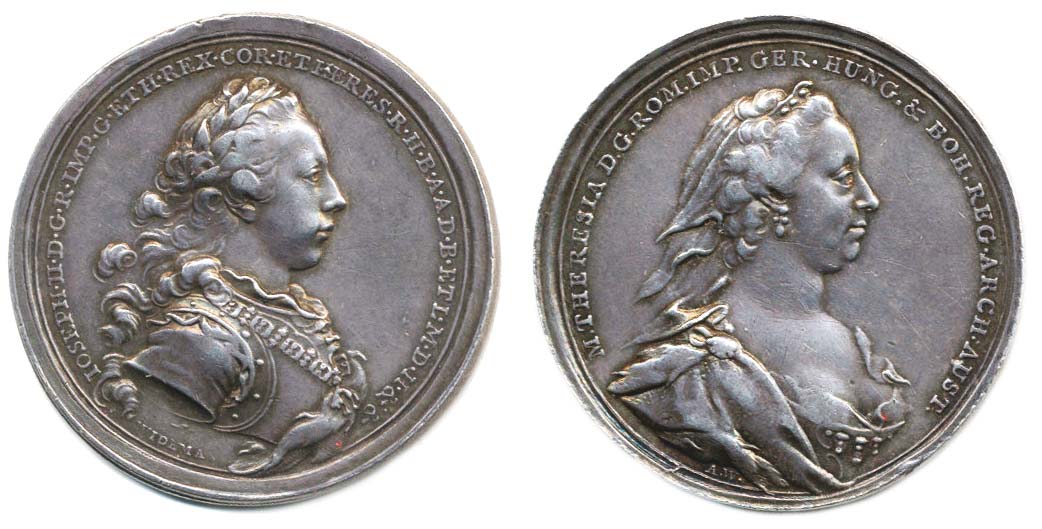 A.Widemann - na převzetí titulu římského císaře a nastoupení spoluvlády s Marií Teresií b.l. (1765), poprsí Josefa II. zprava, opis / poprsí Marie Teresie zprava s vdovským závojem, opis Sign., A.W., Wideman, Ag 42 mm, 26,14 g, Nov.XV/L-7b, Mo.1959_R!