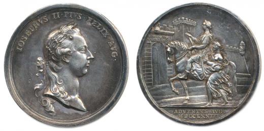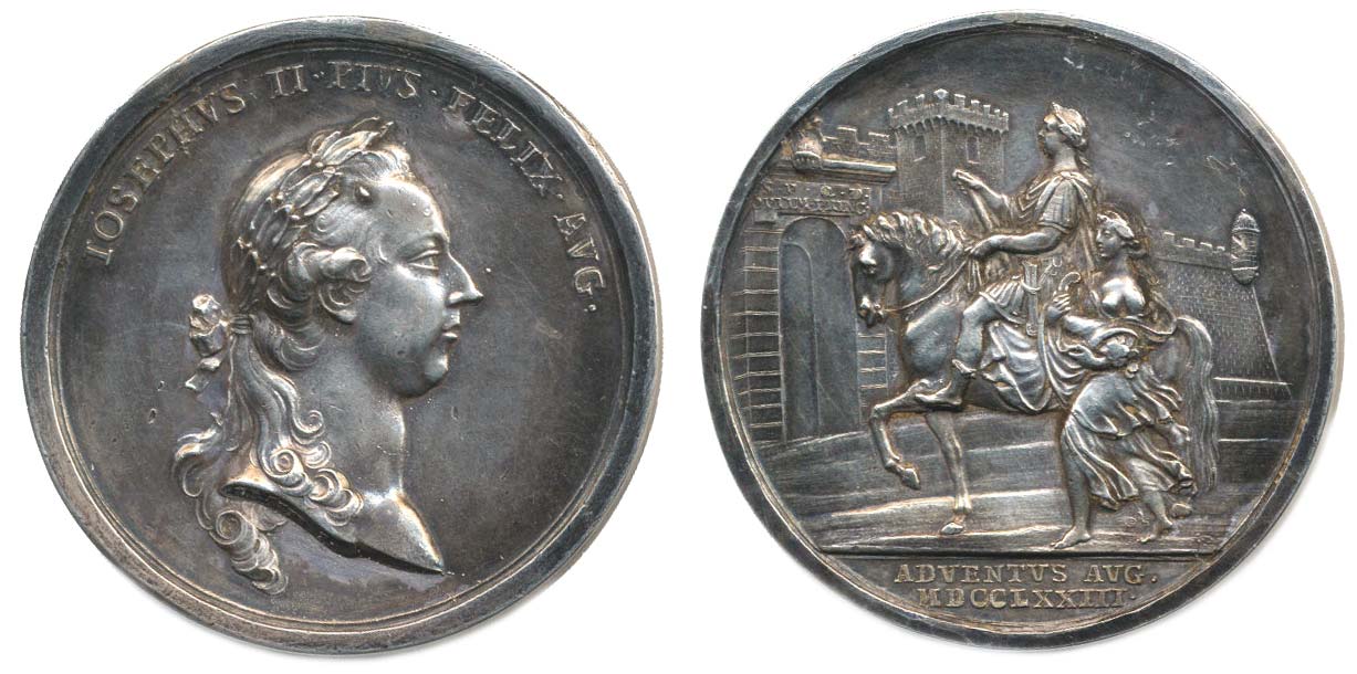 Krafft - medaile na návštěvu Sedmihradska v r. 1773#Ag Poprsí zprava, opis / císař na koni před bránou města, 2řádk.nápis v úseči, Sign., Ag 50 mm, 43.43 g, Mo.2046, Ho.3146, LG.XIV/272 (Br) We.8191, SD.250_R! tém.