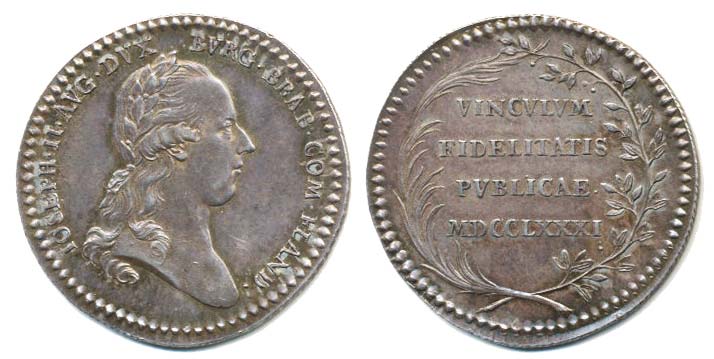 Větší peníz na holdování v Belgii v r.1781#Ag Portrét Josefa II. zprava, opis / 4řádk.nápis ve věnci Ag 28 mm, 6.11 g, Nov.XV/H-6a, Mo.2141, LG.XIV/933 (Bronz)_R! tém.