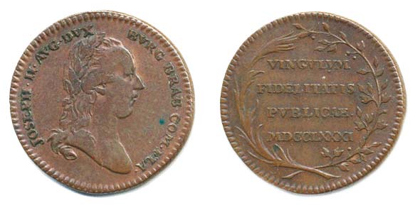 Menší peníz na holdování v Belgii, 1781 Portrét císaře zprava, opis / 4řádk.nápis ve věnci Bronz 22 mm, 3,77 g, Nov.XV/H-8c, LG.XIV/934_R!