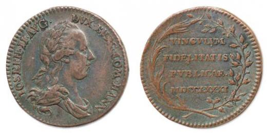 Menší peníz na holdování v Hannegau, 1781 Portrét císaře zprava, opis / 4řádk.nápis ve věnci Bronz 22 mm, 3,53 g, Nov.XV/I-1c, Neum.13429_R!