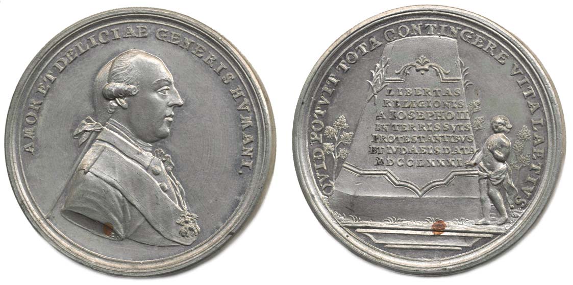 J.L.Oexlein - medaile na vydání tolerančního patentu v r.1781 Portrét zprava, latinský opis /dítě u pomníku se 7řádk.nápisem, opis Sign.OE., Sn 45 mm, 30,49 g, Wu.4109, We.8208 (Ag)_R!