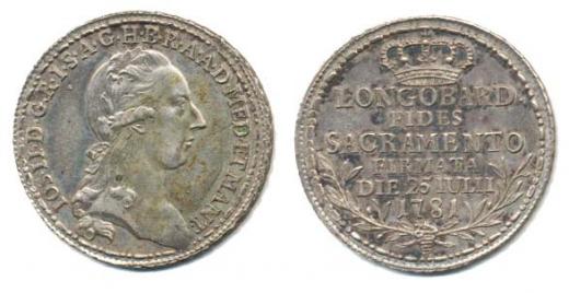 Menší peníz na holdování v Lombardii 25.7.1781 Portrét Josefa II. zprava, opis / 6řádk.nápis pod korunou Ag 23 mm, 3,12 g, Nov.XV/K-2b, Mo.2148_R! tém.