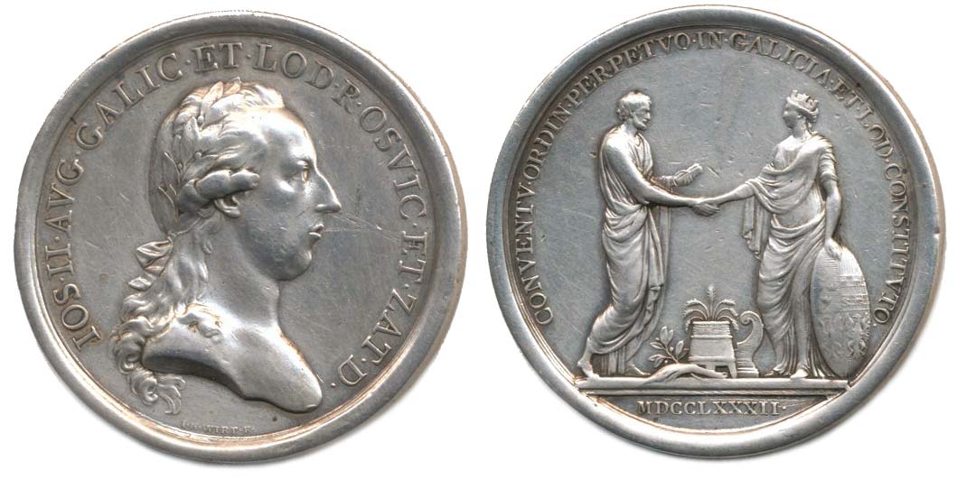 I.N.Wirt - medaile k slavnostnímu shromáždění k ústavě v Haliči a Lodoměři v r.1782, portrét zprava, opis / Galicie se znakem v ruce podává ruku státníkovi, nápis v úseči, opis, Sign., Ag 43 mm, 25,74 g Mo.2150, LG.XIV/940, We.8211