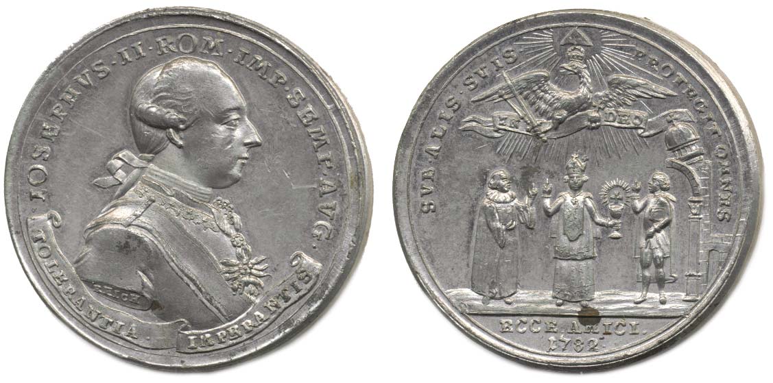 Reich - medaile na vydání tolerančního patentu, 1782 Poprsí zprava, opis / tři představitelé církví pod křídly císařského orla, nápis v úseči, opis, Sn 43 mm, Cu stift Mo.2153 (Ag), LG.XIV/942, ČS.1410_tém.