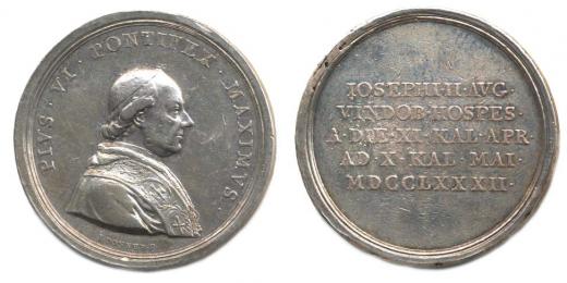 I.Donner - medaile na návštěvu papeže Pia VI. ve Vídni 10.5.1782 Poprsí papeže zprava, opis / 5řádk.nápis, Sign., Ag 38 mm, 17,36 g Mo.2157, Ho.3167, Wu.7450_dr.rysky v av. a rev. R!