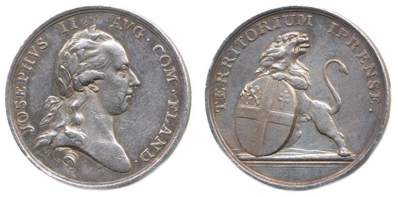 T.van Berckel - holdovací medaile města Ypern v Nizozemí b.l. (1783) Hlava zprava, opis / stojící lev drží znak, opis TERRITORIUM IPRENSE Nesign., Ag 32 mm, 14,22 g, Nov.XV/L-24a, Ho.3160_n.hr. R!