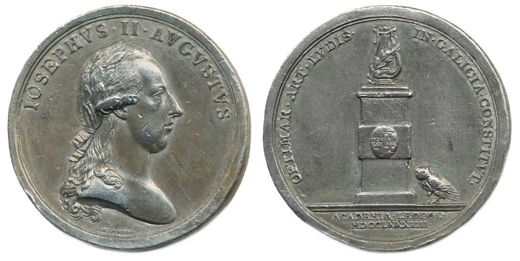 I.N.Wirt - medaile na založení Leopoldovy akademie v Lemburgu (Lvově) v r.1784, poprsí císaře zprava, opis / podstavec s lyrou, u paty sova, 2řádk.nápis v úseči, opis, Sign., Sn 42 mm, 21,01 g, Mo.2161 (Ag), LG.XIV/952 (Ag) We.8220(Ag), Serfas.201_dr.rysky v av. a rev. R!