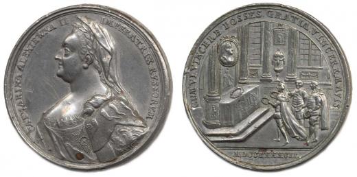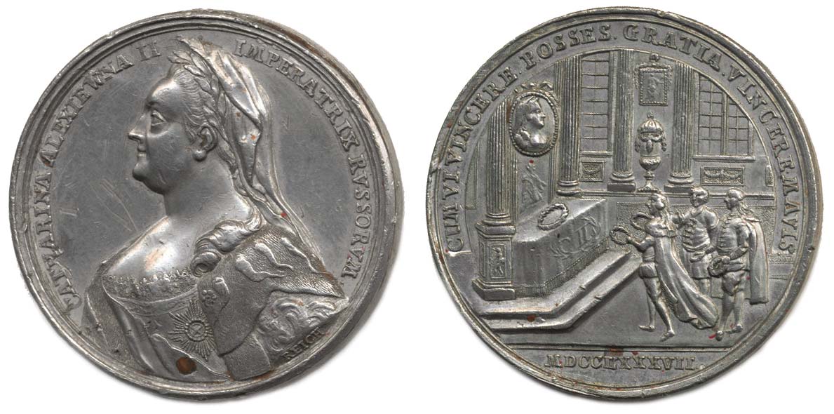 Reich - děkovná medaile na vítězství Rakouska a Ruska nad Osmanskou říší v r.1787 poprsí Kateřiny II. zleva, opis / tři postavy s věnci před obrazem Kateřiny, latinský opis Sign., Sn 47 mm s Cu stiftem_dr.škrce v av. R!