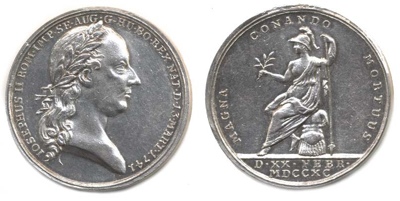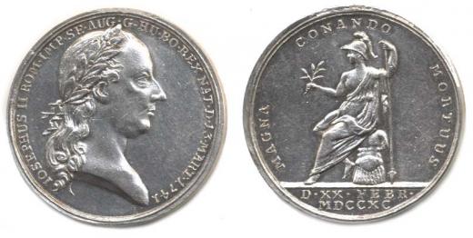 Nesign. - medaile na úmrtí panovníka 10.2.1790 Poprsí zprava, opis / sedící Pallas zleva, 2řádk.nápis v úseči, opis Ag 31 mm, 9,84 g, Mo.2184, LG.XIV/968, We.8226, Ho.3179_R! tém.