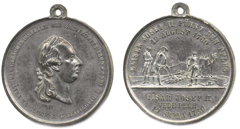 Nesign. - císař Josef II. vede pluh - 100.výročí, 1769 - 1869 Hlava císaře zprava, opis / scéna orby, opis a nápis, Nesign., Sn 32,5 mm, 9,37 g_orig.raž.ouško tém.