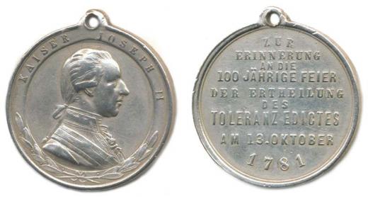 Nesign. - medaile na 100.výr. vydání toleračního patentu 1781-1881 Portrét zprava, opis / 9řádk.nápis, Sn 30 mm, 11,00 g _orig.raž.ouško
