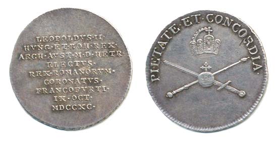 Menší peníz na korunovaci ve Frankfurtu, 9.X.1790 Císařská koruna, zkřížené žezlo a meč, nápis / 9řád. nápis Nesign., Ag 20 mm, 2.18 g, Nov.XVI/E-11b, Mo.2209, Ho.3245