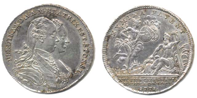 A.Wideman - medaile na sňatek arcivévody s Marií Beatrix d´Este Dvojportrét zprava, opis / řádk.nápis v úseči 15.10.1771, Nesign., Ag 25 mm, 3,98 g, Mo.2035, LG.XIV/267, We.8038, SD.239b