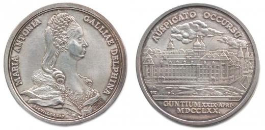 A.Guillemard - pam.medaile na její zastavení v Günzburgu během její zásnubní cesty do Francie 1770, poprsí zprava, opis / zámek v Günzburgu, 2řádk.nápis v úseči, opis, Punc.1000, Ag 43 mm, 20,91 g, Mo.2008, Pol.2, LG.XIV/249, SD.223_NOVORAŽBA