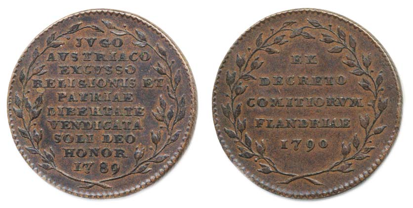 Žeton na nezávislost Flander 1789/1790#Br 10řádk.nápis ve věnci / 5řádk.nápis ve věnci Bronz 33 mm, 12,12 g, Mo.2197 (Ag), Ho.3178 (Ag), LG.XIV/1068