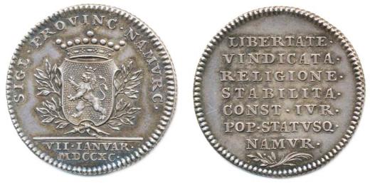 Žeton na nezávislost Namuru 1790#Ag Ve středu lev zleva, 2řádk.nápis v úseči, opis / 7řádk.nápis ve věnci Ag 33 mm, 13,21 g, Mo.2198, LG.XIV/1069 (Br), We.9077_R!