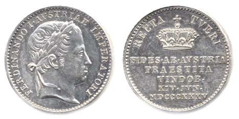 Menší peníz na holdování ve Vídni, 14.VI.1835 Portrét, opis / koruna, nápis, opis, Nesign., Ag 18 mm, 3.3 g, P.2/7, M.2550, H.3614