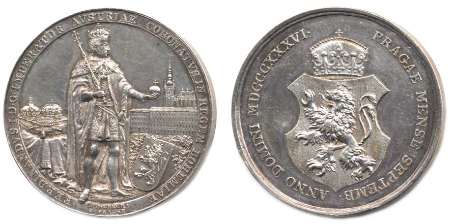 Lerchenau - medaile na korunovaci v Praze, 7.9.1836#Ag Stojící král, koruny na podušce, Pražský hrad, opis / korun.znak, opis, Ag 35 mm, 17.20 g, Nov.XVIII/D-2b, ČS.1491