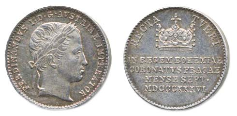 Menší peníz na korunovaci v Praze, 7.IX.1836 Portrét, opis / koruna, nápis, opis, Nesign. Ag 18 mm, 3.29 g, ČS.1494, P.3/24, M.2565, Nov.XVIII/D-4b_tém.