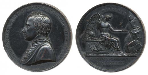Intronizační medaile, 13.V.1832#Br Poprsí zleva, opis / anděl sedící u pramene, nápis, Sign.I.D.BOEHM.F., Bronz 45 mm, Taul.285, LM.541_dr.škr.v av. tém.