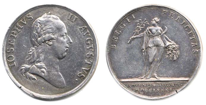 Nesign. - medaile na cestu do Belgie 1781 Hlava zprava, opis / bohyně s rohem hojnosti, 2řádk.nápis, opis Nesign.(v.Berckel), Ag 27 mm, 6.43 g, Mo.2137_2x dr.hr. R!