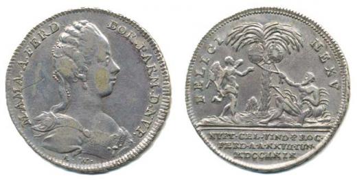 A.Wideman - na zasnoubení s Ferdinandem Bourbonským 27.6.1769, Portrét arcivévodkyně zprava, opis / 2 alegorické postavy pod stromem se znaky, Sign.A.W., Ag 25 mm, 3.91 g, Mo.1999 LG.XIV/238, Ho.3304, SD.215_2x dr.škr.v av.