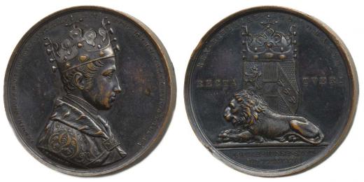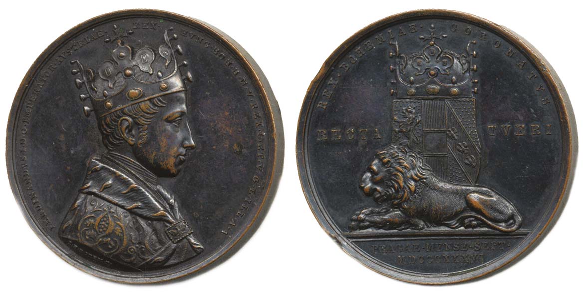 Boehm - medaile na korunovaci v Praze, 7.9.1836#Br Poprsí zprava, opis / ležící lev, korunovaný český znak, 2řádk.nápis v úseči, opis, Cu 47 mm, 57,15 g, Nov.XVIII/D-1c, ČS.1493, P.III/3 _dr.hr.v rev.