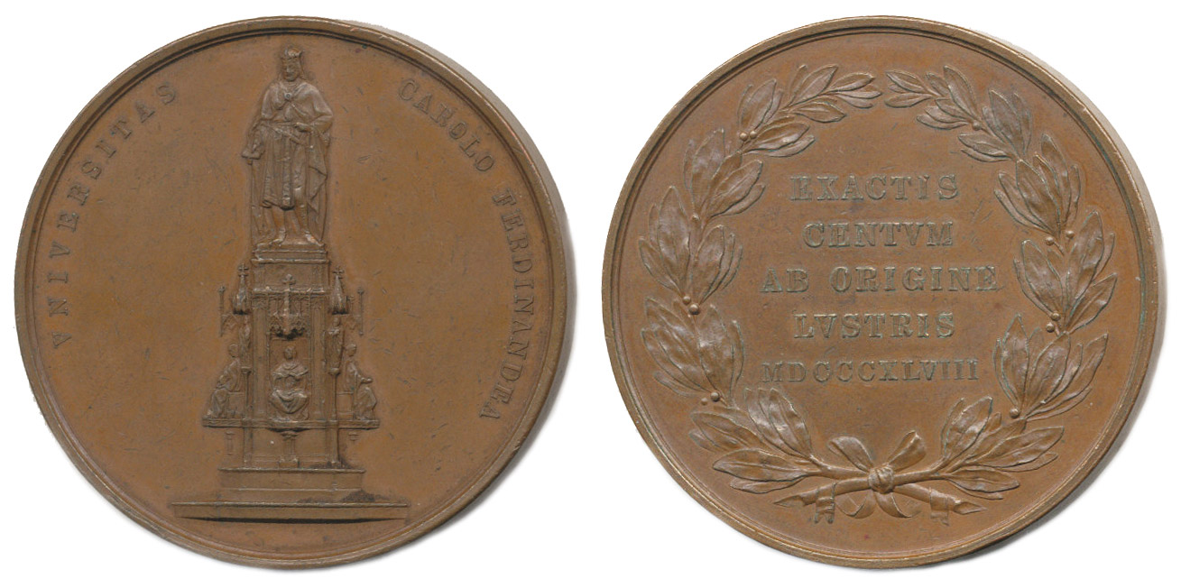 Karlo Ferdinandova universita - 500.výročí založení, 1348 - 1848#Br Pražský pomník císaře Karla IV., latinský opis / 5řádk.nápis ve věnci, Sign., Bronz 52 mm, MZČ.150/7, Ma.7, Do.4877