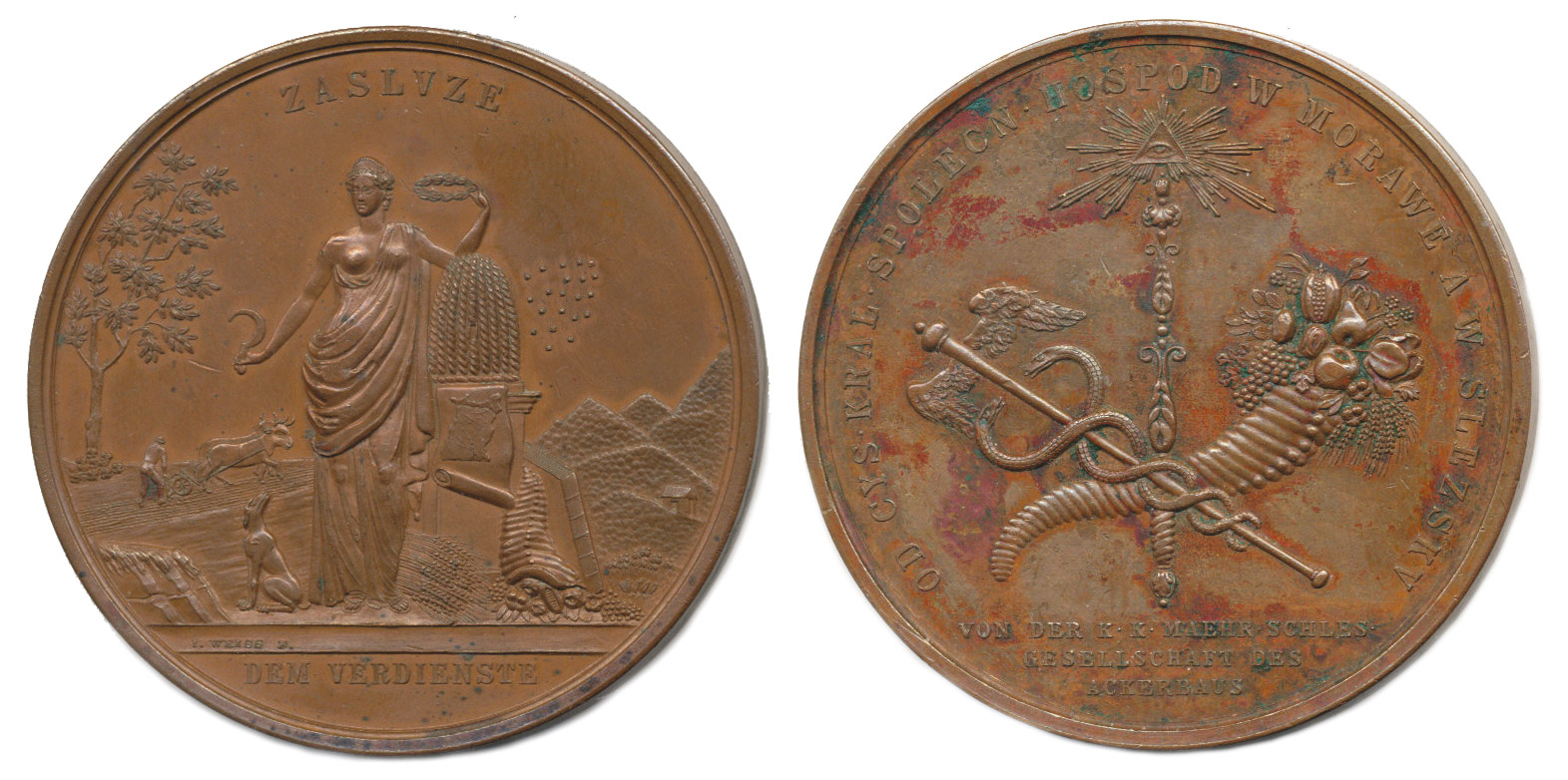 Hospodářská společnost pro Moravu a Slezsko, b.l.#Br Stojící Ceres se symboly úrody, nápis / symboly moci a bohatství, písmo, Sign., Bronz 62 mm, MZČ.119/2, Ho.6095_tém.