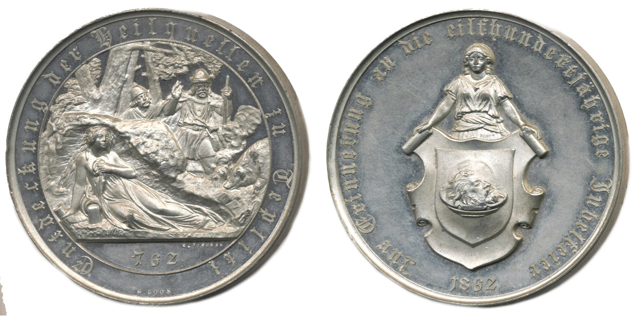 Loos - na XI.sekulární slavnost k 1100.výr. objevení léčebných pramenů 762 - 1862 znak města, opis / motiv objevení pramenů, opis Sign.G.Loos, K.Fischer, Sn 50 mm