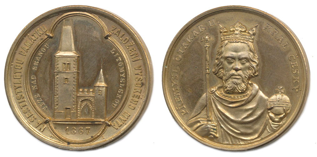 Na šestistyletou památku založení města 1867#Pozl Poprsí Přemysla Otakara II. čelně, opis / pohled na městskou bránu, dvojitý opis, Sign.W-S (V.Seidan), Pozl.bronz 40 mm, (na hr. označeno POZLACENO), MZČ.150/50, Mar.105