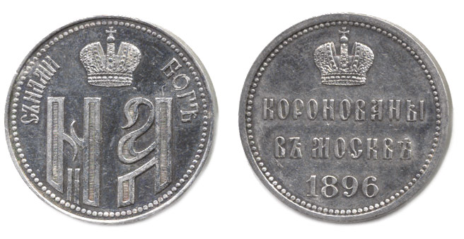 Mikuláš II. - jeton na korunovaci v Moskvě, 1896 Korunovaný carský monogram, opis / koruna, třířádkový nápis, Nesign., Nepunc., Ag 25 mm, 7,34 g_R!