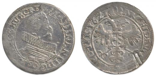 1/2 Tolar-60 Krejcar 1621 BZ, Olomouc, B.Zwierner MKČ.899pod., var.perličkové okruží, opis CO.TYR. mincovní značka v závorce_č.ned., stopa po úchytu kleští