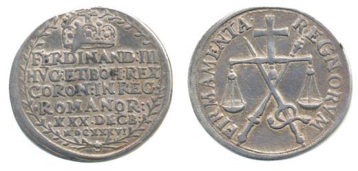 Velký jeton na korunovaci na římského krále v Řezně, 30.12.1636 6řádk.nápis / zkřížené meč, žezloa kříž, opis Ag 28 mm, 3,85 g, Nov.VII/E-2b, Mo.800, LG.II/445_dr.okr. R!