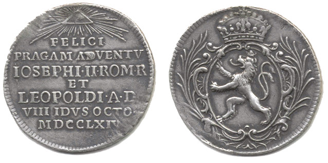 Peníz na příjezd princů do Prahy, 1764 Pod Božím okem nápis / ve věnci v korunované kartuši, český lev, Nesign., Ag 25 mm, 4.6 g, ČS.1409, LG.XIV/193, Mo.1931, SD.170 _dr.just. v rev.