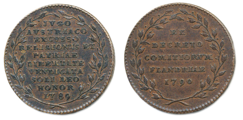 Žeton na nezávislost Flander 1789/1790#Br 10řádk.nápis ve věnci / 5řádk.nápis ve věnci Bronz 33 mm, 12,12 g, Mo.2197 (Ag), Ho.3178 (Ag), LG.XIV/1068