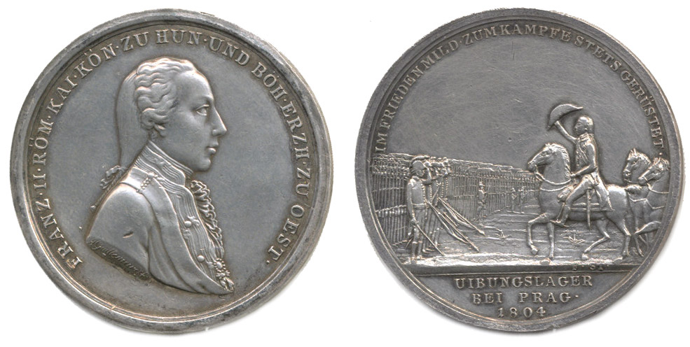 Guillemard - návštěva vojenského ležení u Prahy, 1804#Ag Poprsí zprava sŘádem zlatého rouna, opis / císař na koni zdraví nastoupené vojáky, písmo, Sign., Ag 39 mm, 17,12 g, PG.142, ČS.1443, Mo.2334, Ho.3365, LG.XIV/1249_R! tém.