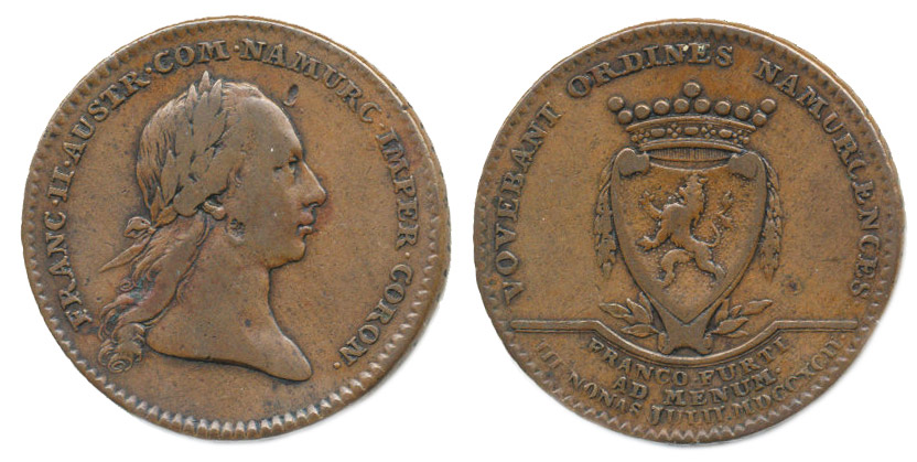 Medaile na holdování v Namuru, 1792#Br Portrét zprava, opis / korunov.znak, opis, 3řádk.nápis v úseči Nesign., Bronz 34 mm, Nov.XVII/F-1c, LG.XIV/1185_dr.ďub. v av. R!