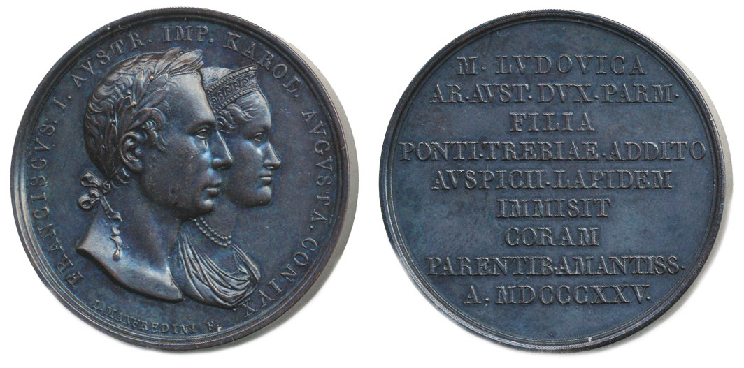 l.Manfredini - medaile na položení základního kamene mostu přes řeku Trebii v Lombardii 1825, dvojportrét císařského páru zprava, opis / 9řádk.nápis, Sign., Bronz 42 mm, 40, 76 g Mo.2498, Ho.3469, LG.XII/133, Wu.2408, We.8542_R! tém.