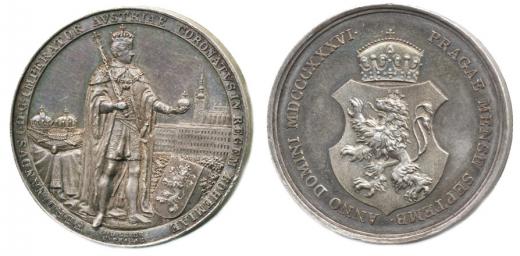 Lerchenau - medaile na korunovaci v Praze, 7.9.1836#Ag Stojící král, koruny na podušce, Pražský hrad, opis / korun.znak, opis, Ag 35 mm, 17.19 g, Nov.XVIII/D-2b, ČS.1491_tém.