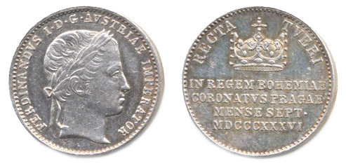 Menší peníz na korunovaci v Praze, 7.IX.1836 Portrét, opis / koruna, nápis, opis, Nesign. Ag 18 mm, 3.26 g, ČS.1494, P.3/24, M.2565, Nov.XVIII/D-4b_tém.