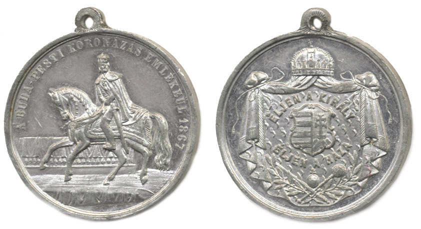 Maďarská medaile na korunovaci v Budíně, 8.6.1867 Císař na koni, opis / uherská koruna a znak, maď.opis Nesign., Sn 32 mm, 10,69 g, Nov.XIX/24a_orig.raž.ouško