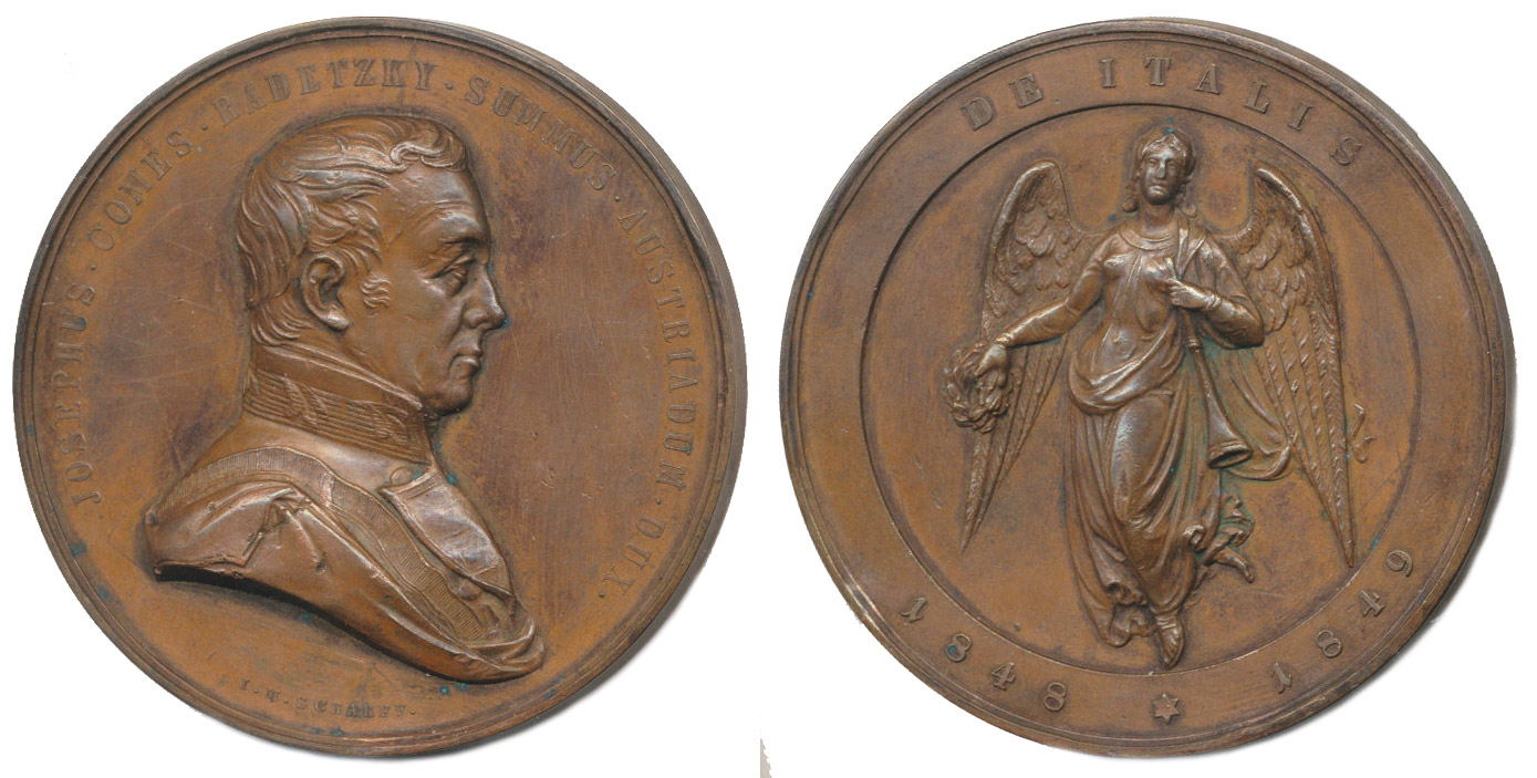I.M.Scharff - medaile na italská vítězství, 1848-1849#Cu Poprsí zprava, opis / Victoria zpředu s vavřínovým věncem, opis, Sign., Cu 57 mm, BPM.335, M.2650_dr.škrce v av. a rev.