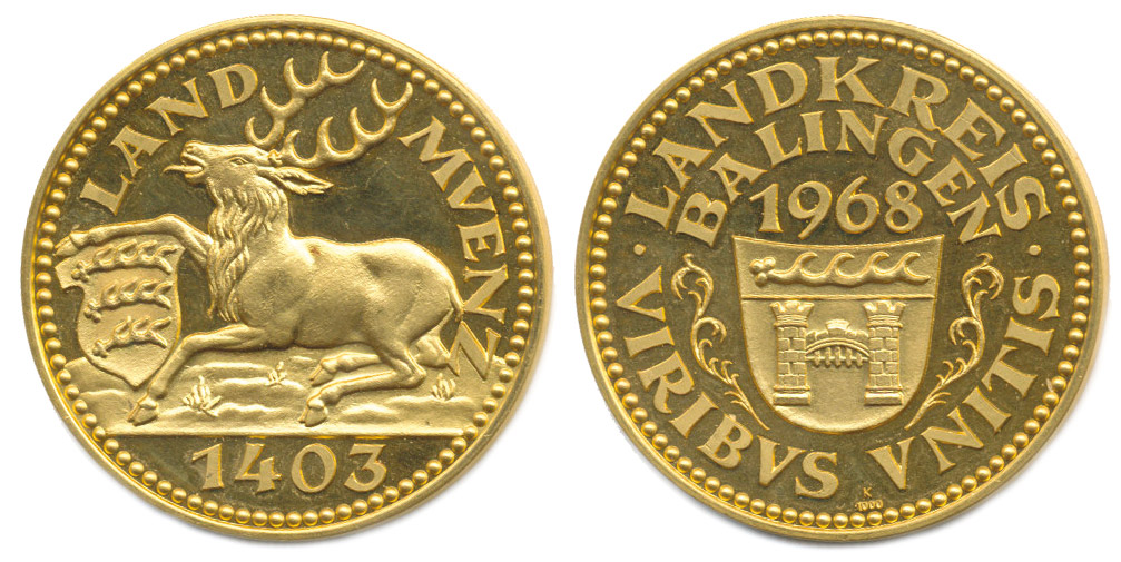 Bádensko - Würtembersko - Balingen - Land Muenz 1403 / Landkreis Balingen - Viribus Unitis 1968, jelen zleva drží znak, opis / znak, kolem dvojitý opis, Punc.K 1000, 40 mm, 36,37 g_akpsle