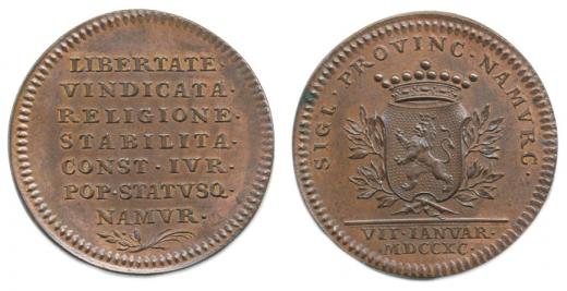 Žeton na nezávislost Namuru 1790#Br Ve středu lev zleva, 2řádk.nápis v úseči, opis / 7řádk.nápis ve věnci Bronz 33 mm, 12,70 g, Mo.2198 (Ag), LG.XIV/1069, We.9077_R!