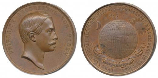 Friedrich I. - medaile na 34. shromáždění přírodovědců a lékařů v Karlsruhe v září 1858, portrét velkovévody, opis / zeměkoule s fázemi měsíce, na stuhách nápis, opis, Nesign., Bronz 46 mm, 52,64 g