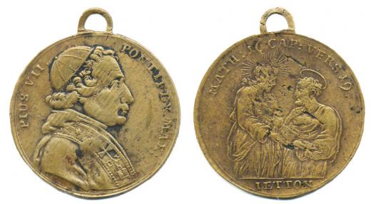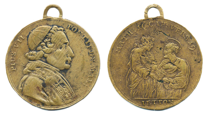 Nesign. - žeton na biblický citát Mat.16, 19, b.l. (1800) Poprsí papeže zprava, opis / Kristus předává klíče Petrovi, dole nápis IETTON, Mosaz 33 mm_dr.v.stř. v rev.
