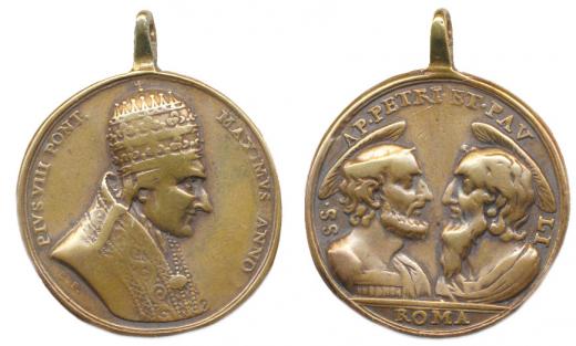 Pontifikační medaile b.l. (1829) Poprsí zprava, opis / poprsí sv.Petra a Pavla proti sobě, opis Sign.C.P., Mosaz 34 mm_orig.kolmé ouško